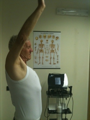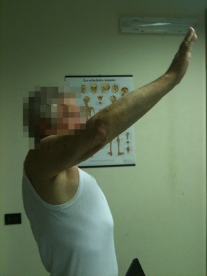 Paziente di anni 65 operato a seguito di frattura pluriframmentaria della testa omerale di destra e sostituzione della stessa con protesi totale. Il paziente dopo l’intervento ha portato tutore rigido per 2 mesi ed ha iniziato la fisioterapia dopo 1 mese e mezzo.All’inizio della terapia presentava marcata ipotonia del deltoide, a seguito di lesione del nervo circonflesso avvenuta a causa della frattura. Aveva forte dolore ( vas 9 ) ed impotenza funzionale su tutti i piani dello spazio. Questa la situazione a 3 mesi post operatori. Abbiamo lavorato sul recupero articolare anche di gomito e polso, sul ritmo scapolo-omerale e sulla propriocezione. L’articolarità è migliorata notevolmente ed il dolore diminuito ( vas 3 ).